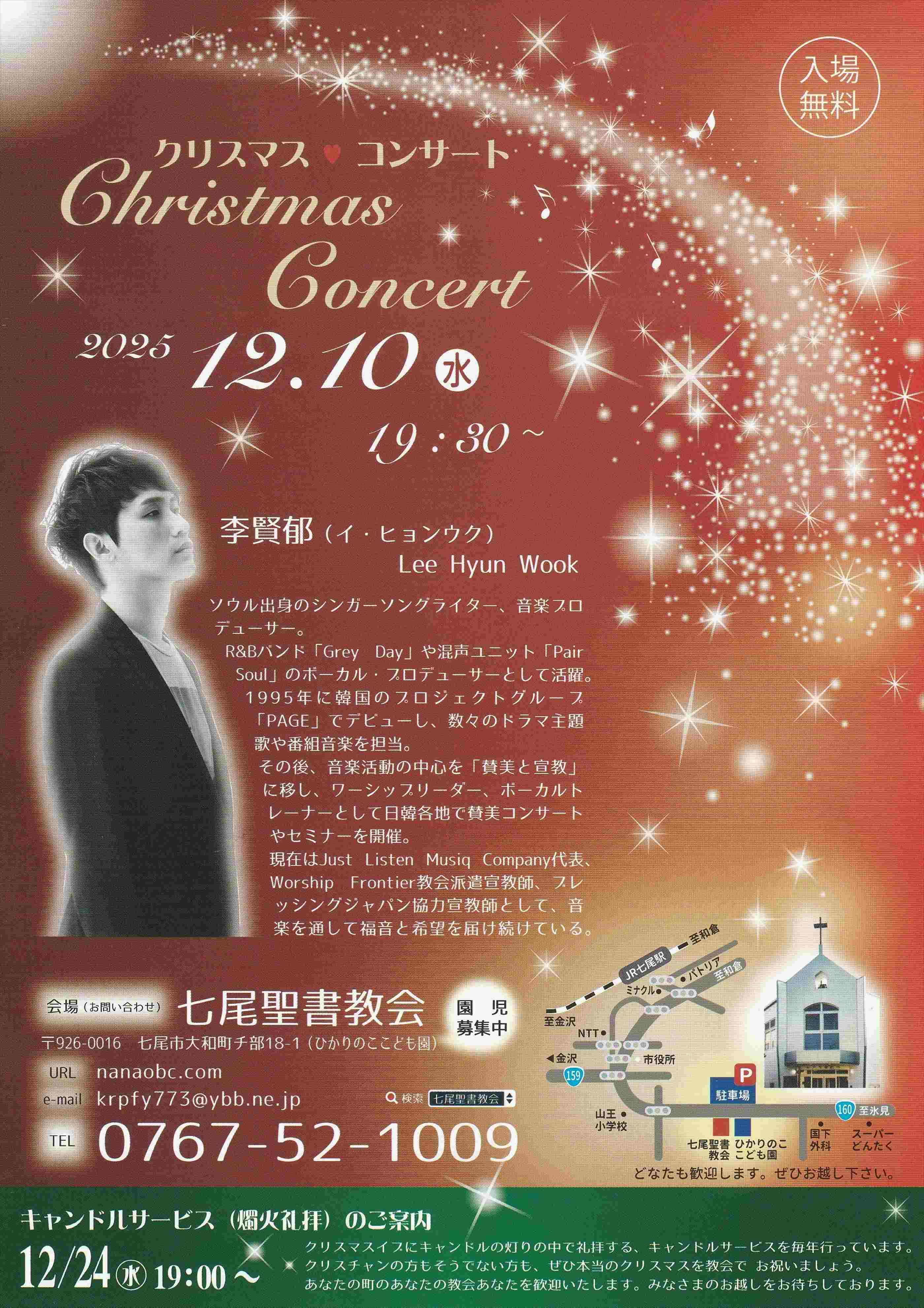 2025年12月10日(水)午後7:30から七尾聖書教会においてクリスマスコンサートが行われます。どなたも歓迎します。ぜひお越しください。