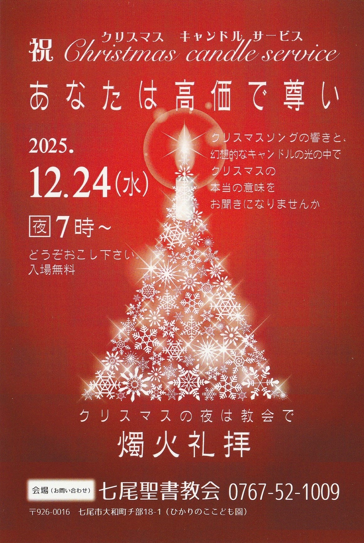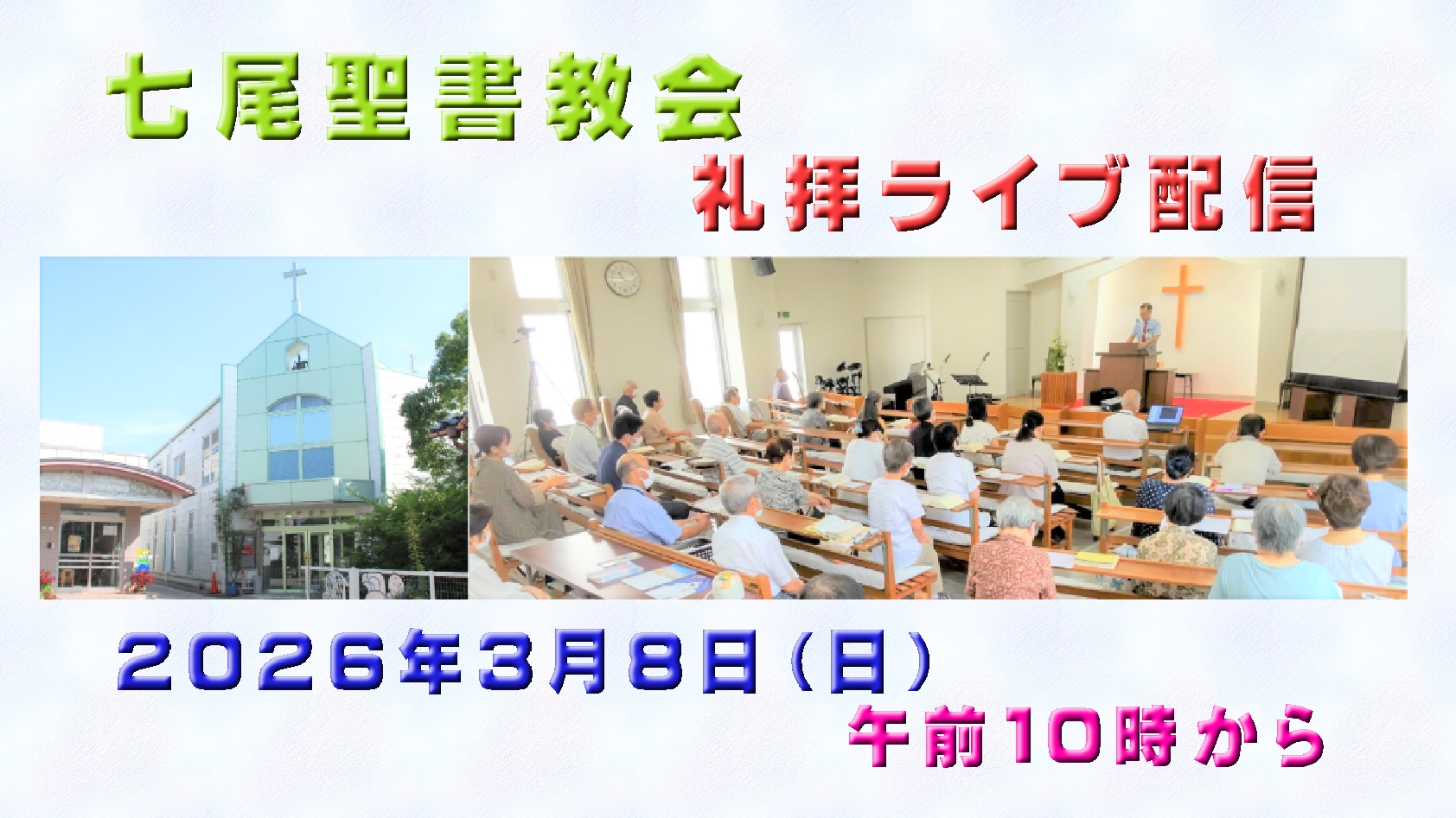 ようこそ、七尾聖書教会のホームページへ。 七尾聖書教会は、石川県七尾市大和町にある聖書教会連盟に所属するプロテスタントの教会です。 私たちの教会は1965年に宗教法人となり2015年で設立50周年を迎えこの地に根ざして、その歩みを続けています。 七尾聖書教会は、あなたの町のあなたの教会です。あなたを歓迎いたします。教会に行ったことがないという方もお気軽にお越しください。お待ちしております。